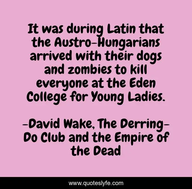 This page presents the quote "It was during Latin that the Austro-Hungarians arrived with their dogs and zombies to kill everyone at the Eden College for Young Ladies.". Author of this quote is David Wake, The Derring-Do Club and the Empire of the Dead. This quote is about steampunk, opening-lines, humor, humour, zombies,.