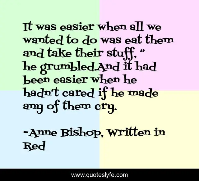 This page presents the quote "It was easier when all we wanted to do was eat them and take their stuff, ” he grumbled.And it had been easier when he hadn’t cared if he made any of them cry.". Author of this quote is Anne Bishop, Written in Red. This quote is about funny, comedy, sweet,.
