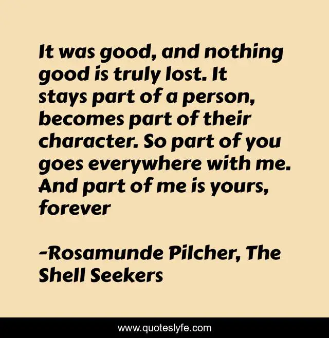 This page presents the quote "It was good, and nothing good is truly lost. It stays part of a person, becomes part of their character. So part of you goes everywhere with me. And part of me is yours, forever". Author of this quote is Rosamunde Pilcher, The Shell Seekers. This quote is about lovers, love, affection,.