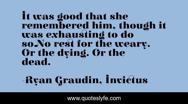 This page presents the quote "It was good that she remembered him, though it was exhausting to do so.No rest for the weary. Or the dying. Or the dead.". Author of this quote is Ryan Graudin, Invictus. This quote is about remembered, death-and-dying, weary,.
