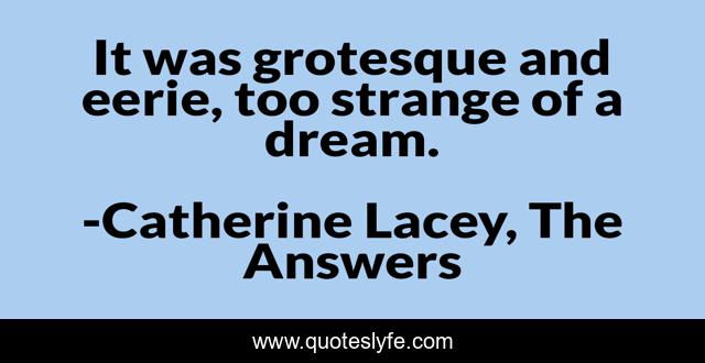 This page presents the quote "It was grotesque and eerie, too strange of a dream.". Author of this quote is Catherine Lacey, The Answers. This quote is about description, eerie, the-answers, catherine-lacey, grotesque, dream,.