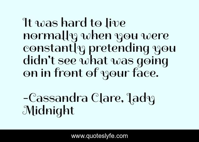 This page presents the quote "It was hard to live normally when you were constantly pretending you didn't see what was going on in front of your face.". Author of this quote is Cassandra Clare, Lady Midnight. This quote is about life, love, the-dark-artifices, cassandra-clare, lady-midnight, lies, truth, affection,.