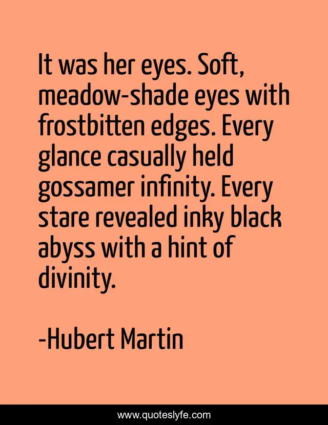This page presents the quote "It was her eyes. Soft, meadow-shade eyes with frostbitten edges. Every glance casually held gossamer infinity. Every stare revealed inky black abyss with a hint of divinity.". Author of this quote is Hubert Martin. This quote is about love, honesty, intelligence, deep, sleep, best, poem, confidence, humor,.