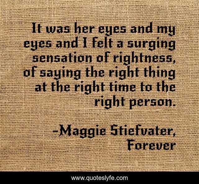 This page presents the quote "It was her eyes and my eyes and I felt a surging sensation of rightness, of saying the right thing at the right time to the right person.". Author of this quote is Maggie Stiefvater, Forever. This quote is about life, love, money, advice, school, wisdom, romance, quotes, book,.