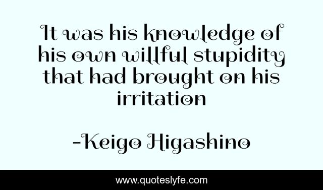 This page presents the quote "It was his knowledge of his own willful stupidity that had brought on his irritation". Author of this quote is Keigo Higashino. This quote is about knowledge-of-self, stupidity,.