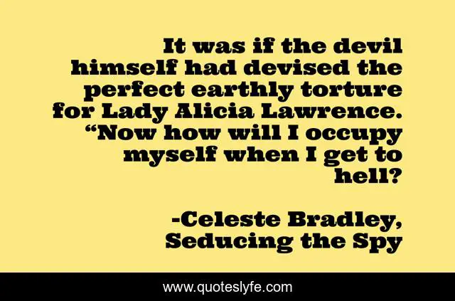 This page presents the quote "It was if the devil himself had devised the perfect earthly torture for Lady Alicia Lawrence. “Now how will I occupy myself when I get to hell?". Author of this quote is Celeste Bradley, Seducing the Spy. This quote is about funny-book, spy, historical-romance, regency-romance, royal-four, snarky, romance,.