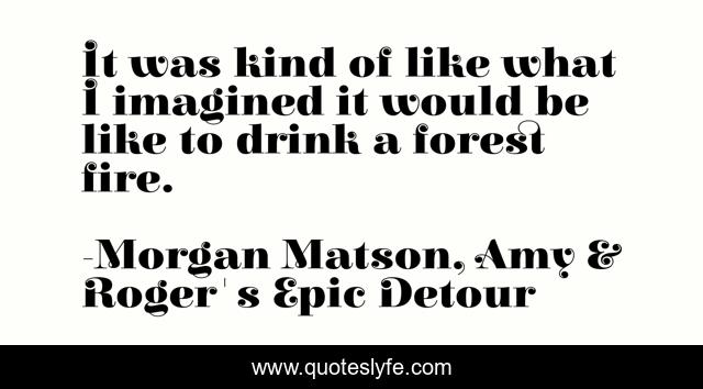 This page presents the quote "It was kind of like what I imagined it would be like to drink a forest fire.". Author of this quote is Morgan Matson, Amy & Roger's Epic Detour. This quote is about fire, road-trip, detour, forest,.