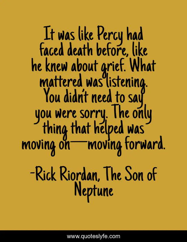This page presents the quote "It was like Percy had faced death before, like he knew about grief. What mattered was listening. You didn’t need to say you were sorry. The only thing that helped was moving on—moving forward.". Author of this quote is Rick Riordan, The Son of Neptune. This quote is about percy-jackson, frank-zhang,.