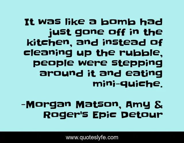 This page presents the quote "It was like a bomb had just gone off in the kitchen, and instead of cleaning up the rubble, people were stepping around it and eating mini-quiche.". Author of this quote is Morgan Matson, Amy & Roger's Epic Detour. This quote is about loss, funeral, death, thoughtful, surreal,.
