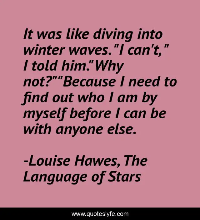 This page presents the quote "It was like diving into winter waves. "I can't, " I told him."Why not?""Because I need to find out who I am by myself before I can be with anyone else.". Author of this quote is Louise Hawes, The Language of Stars. This quote is about self-love, princesses-don-t-need-princes, independence,.
