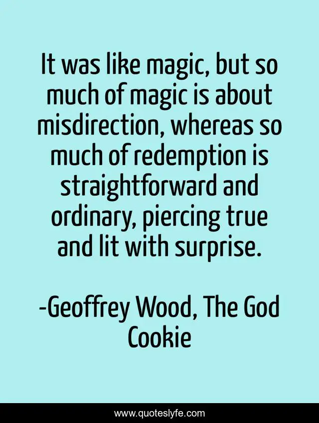 This page presents the quote "It was like magic, but so much of magic is about misdirection, whereas so much of redemption is straightforward and ordinary, piercing true and lit with surprise.". Author of this quote is Geoffrey Wood, The God Cookie. This quote is about magic, redemption, god, christianity, religion, surprise, christian-fiction,.