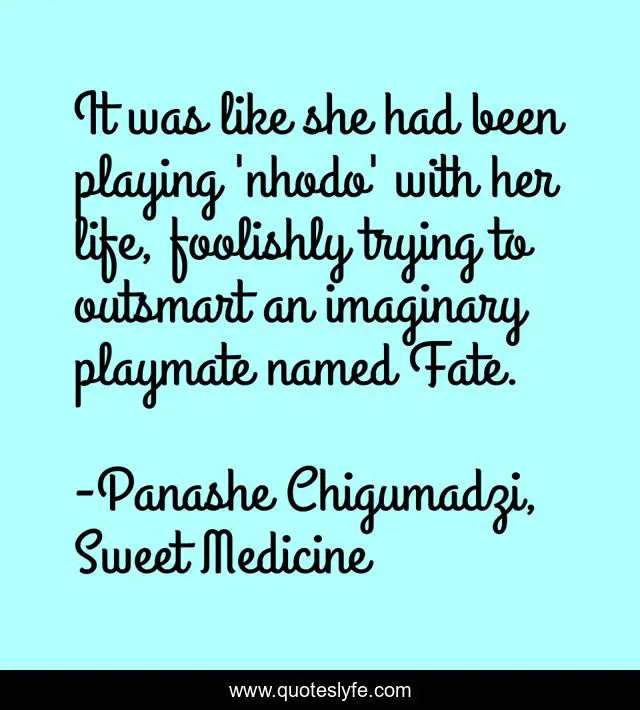 This page presents the quote "It was like she had been playing 'nhodo' with her life, foolishly trying to outsmart an imaginary playmate named Fate.". Author of this quote is Panashe Chigumadzi, Sweet Medicine. This quote is about life, hardship, fate,.