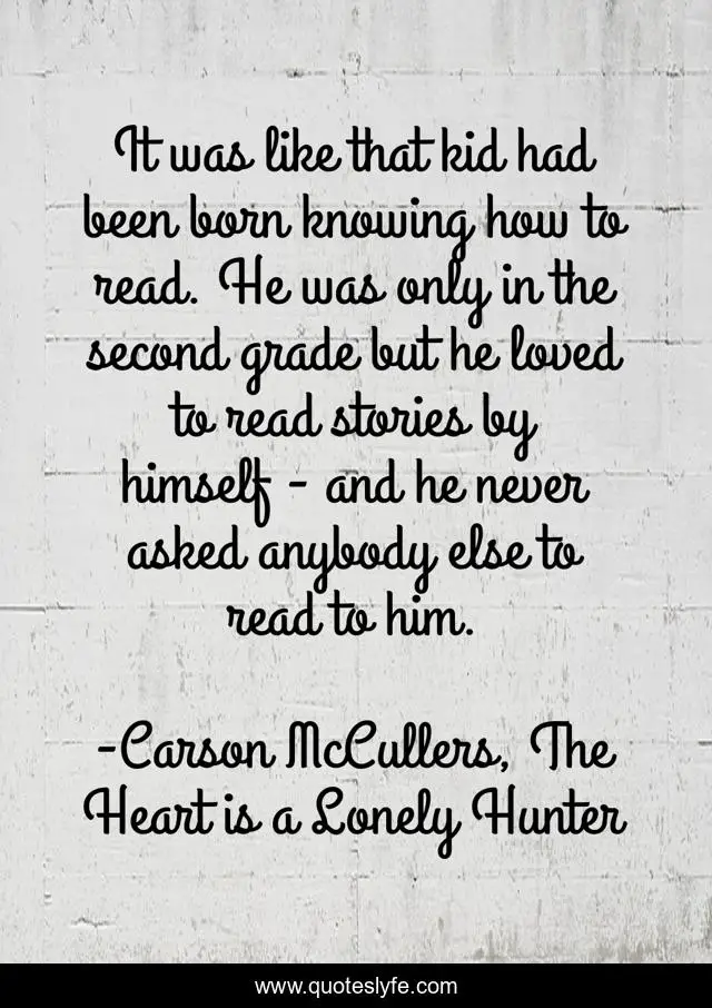 This page presents the quote "It was like that kid had been born knowing how to read. He was only in the second grade but he loved to read stories by himself - and he never asked anybody else to read to him.". Author of this quote is Carson McCullers, The Heart is a Lonely Hunter. This quote is about reading, love-of-reading,.