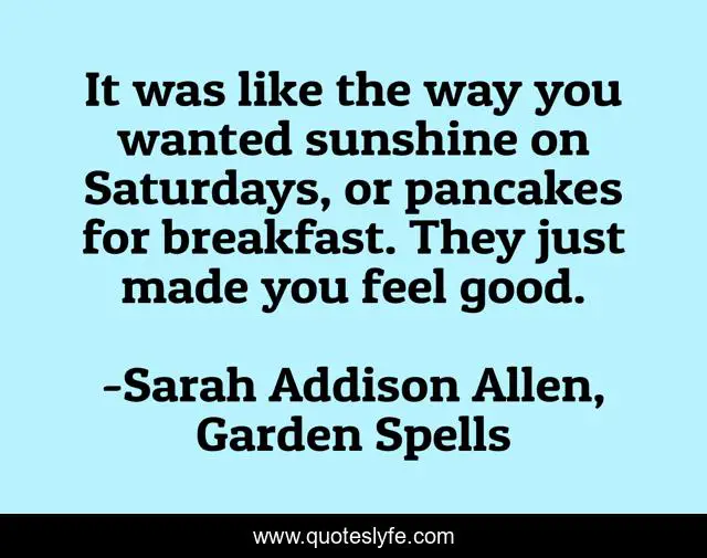 This page presents the quote "It was like the way you wanted sunshine on Saturdays, or pancakes for breakfast. They just made you feel good.". Author of this quote is Sarah Addison Allen, Garden Spells. .