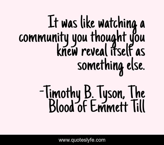 This page presents the quote "It was like watching a community you thought you knew reveal itself as something else.". Author of this quote is Timothy B. Tyson, The Blood of Emmett Till. This quote is about change, community,.