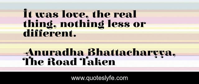 This page presents the quote "It was love, the real thing, nothing less or different.". Author of this quote is Anuradha Bhattacharyya, The Road Taken. This quote is about lovers, love, love-story, affection,.