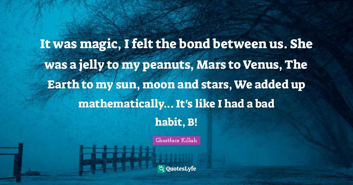 This page presents the quote "It was magic, I felt the bond between us. She was a jelly to my peanuts, Mars to Venus, The Earth to my sun, moon and stars, We added up mathematically... It's like I had a bad habit, B!". Author of this quote is Ghostface Killah. This quote is about habit, venus, sun, earth, moon and stars, magic, peanuts, mars, jelly,.