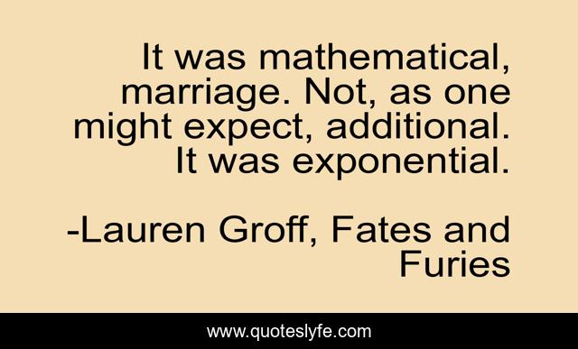 This page presents the quote "It was mathematical, marriage. Not, as one might expect, additional. It was exponential.". Author of this quote is Lauren Groff, Fates and Furies. This quote is about love, marriage, affection,.