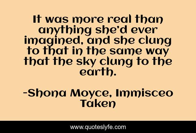 This page presents the quote "It was more real than anything she’d ever imagined, and she clung to that in the same way that the sky clung to the earth.". Author of this quote is Shona Moyce, Immisceo Taken. This quote is about real, love, hope, affection,.