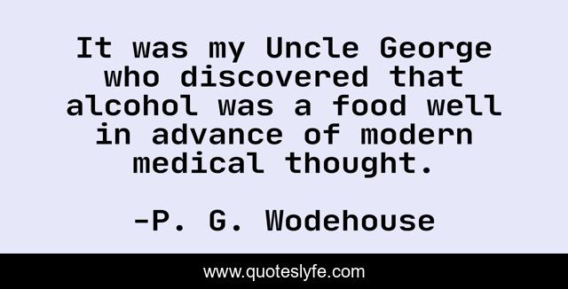 This page presents the quote "It was my Uncle George who discovered that alcohol was a food well in advance of modern medical thought.". Author of this quote is P. G. Wodehouse. This quote is about food, thought, alcohol,.