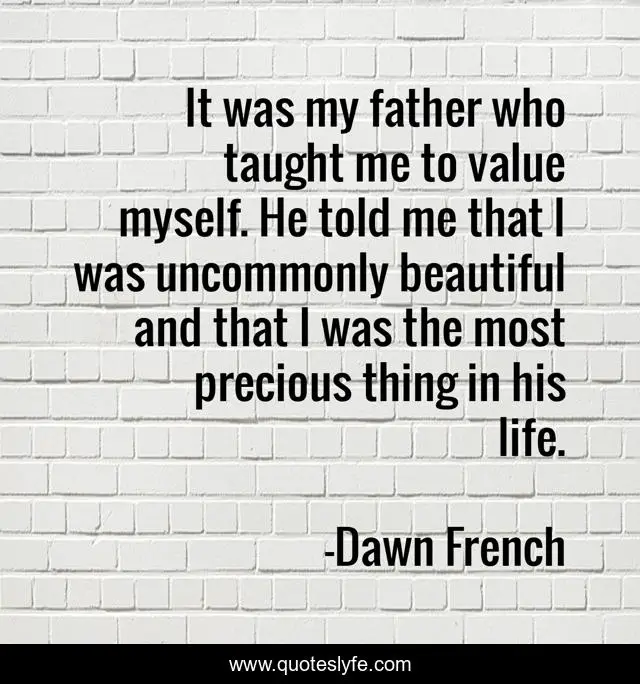This page presents the quote "It was my father who taught me to value myself. He told me that I was uncommonly beautiful and that I was the most precious thing in his life.". Author of this quote is Dawn French. This quote is about beautiful, myself, father,.