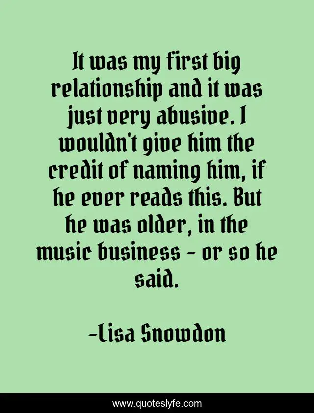 This page presents the quote "It was my first big relationship and it was just very abusive. I wouldn't give him the credit of naming him, if he ever reads this. But he was older, in the music business - or so he said.". Author of this quote is Lisa Snowdon. This quote is about credit, music, relationship,.