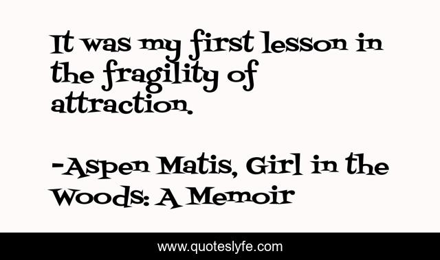 This page presents the quote "It was my first lesson in the fragility of attraction.". Author of this quote is Aspen Matis, Girl in the Woods: A Memoir. This quote is about aspen-matis, memoir, hiking-the-pct,.