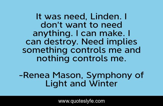 This page presents the quote "It was need, Linden. I don’t want to need anything. I can make. I can destroy. Need implies something controls me and nothing controls me.". Author of this quote is Renea Mason, Symphony of Light and Winter. This quote is about need, heat, passion,.