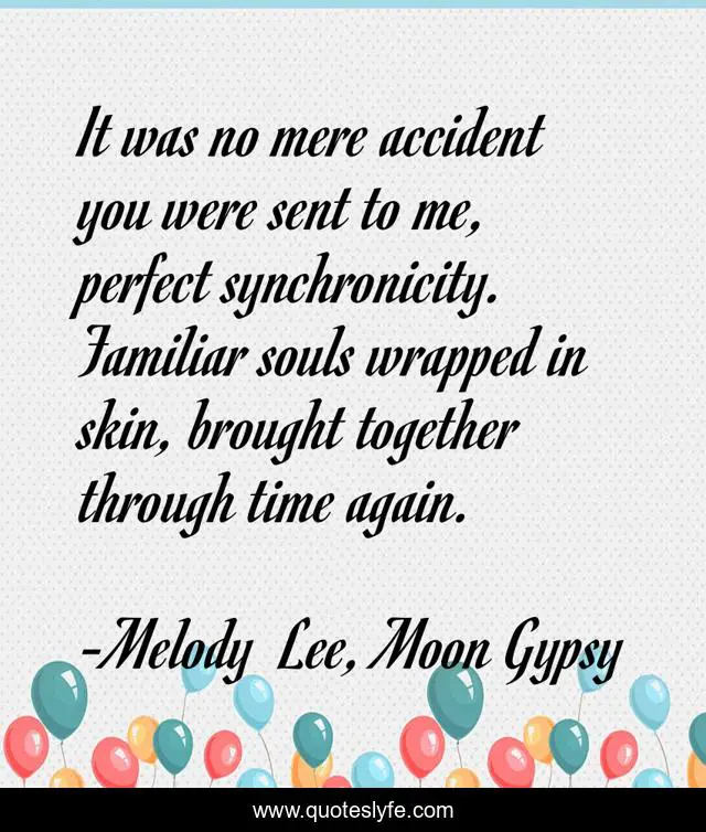 This page presents the quote "It was no mere accident you were sent to me, perfect synchronicity. Familiar souls wrapped in skin, brought together through time again.". Author of this quote is Melody Lee, Moon Gypsy. This quote is about relationships, love, soul-mates, poetry, souls, affection,.