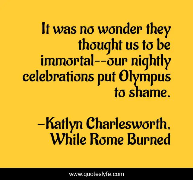 This page presents the quote "It was no wonder they thought us to be immortal––our nightly celebrations put Olympus to shame.". Author of this quote is Katlyn Charlesworth, While Rome Burned. This quote is about gods, ancient-rome, olympus,.