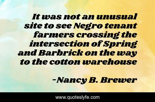 This page presents the quote "It was not an unusual site to see Negro tenant farmers crossing the intersection of Spring and Barbrick on the way to the cotton warehouse". Author of this quote is Nancy B. Brewer. This quote is about civil-war, historical-romance, historical-fiction,.