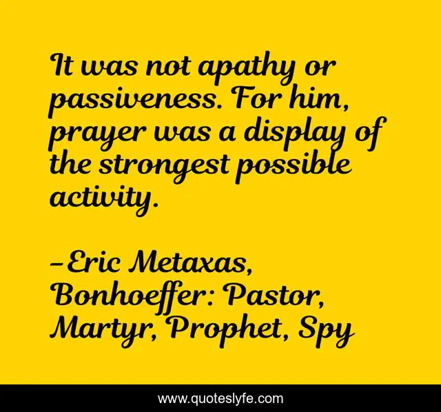 This page presents the quote "It was not apathy or passiveness. For him, prayer was a display of the strongest possible activity.". Author of this quote is Eric Metaxas, Bonhoeffer: Pastor, Martyr, Prophet, Spy. This quote is about prayer, spiritual-warfare,.