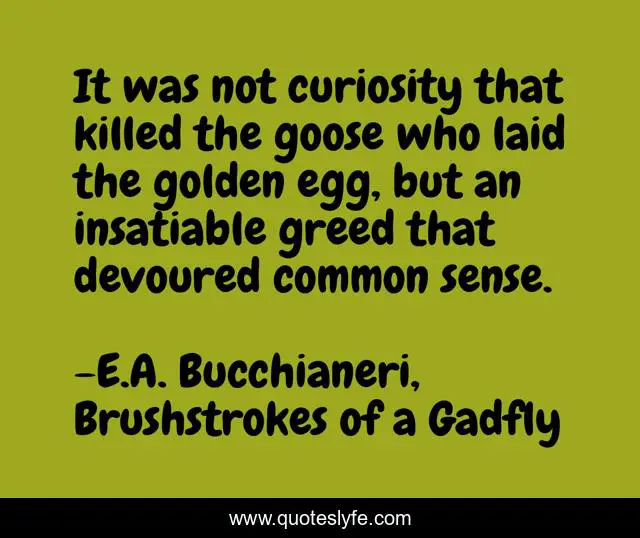 This page presents the quote "It was not curiosity that killed the goose who laid the golden egg, but an insatiable greed that devoured common sense.". Author of this quote is E.A. Bucchianeri, Brushstrokes of a Gadfly. This quote is about proverbs, deadly-sins, greediness, gold, faults, human-nature, riches, gadfly, wisdom,.