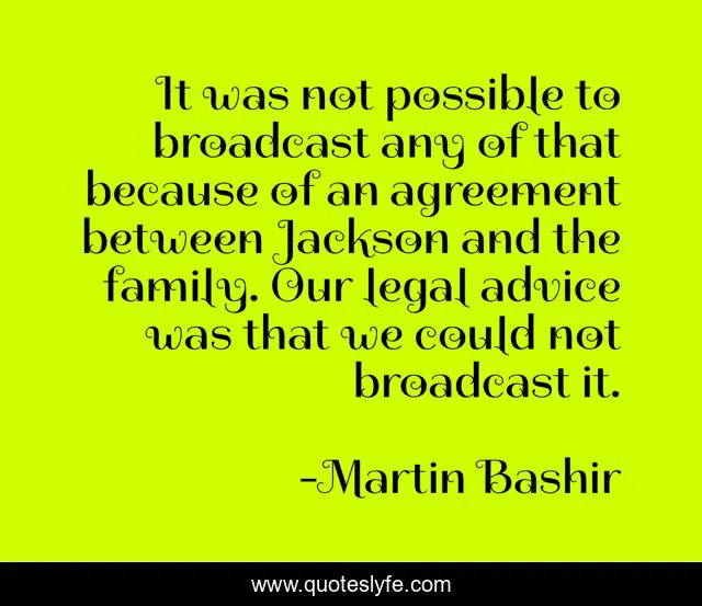 This page presents the quote "It was not possible to broadcast any of that because of an agreement between Jackson and the family. Our legal advice was that we could not broadcast it.". Author of this quote is Martin Bashir. This quote is about advice, agreement, family,.
