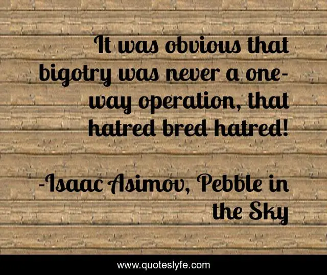 This page presents the quote "It was obvious that bigotry was never a one-way operation, that hatred bred hatred!". Author of this quote is Isaac Asimov, Pebble in the Sky. .