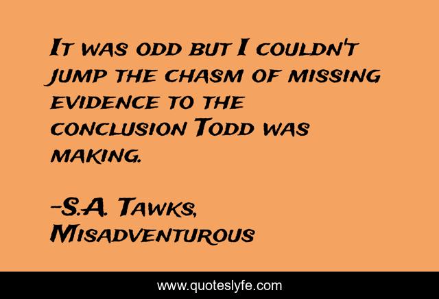 This page presents the quote "It was odd but I couldn't jump the chasm of missing evidence to the conclusion Todd was making.". Author of this quote is S.A. Tawks, Misadventurous. This quote is about australia, brisbane, crime, adventure, queensland, adventurous,.