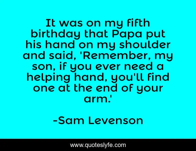 This page presents the quote "It was on my fifth birthday that Papa put his hand on my shoulder and said, 'Remember, my son, if you ever need a helping hand, you'll find one at the end of your arm.'". Author of this quote is Sam Levenson. This quote is about end, remember, son,.