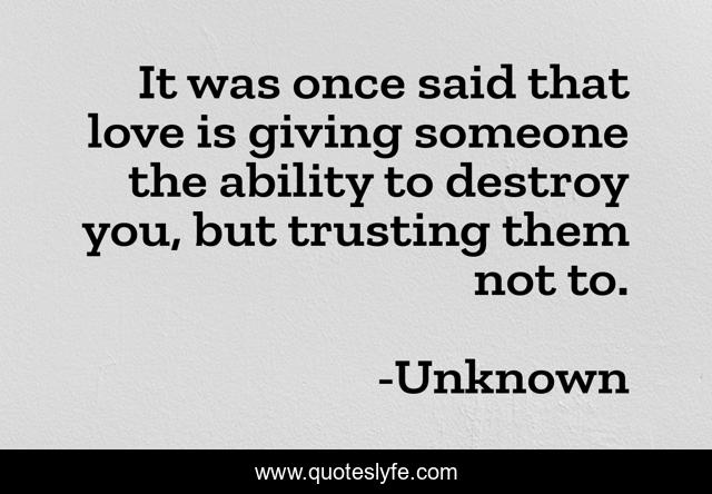 This page presents the quote "It was once said that love is giving someone the ability to destroy you, but trusting them not to.". Author of this quote is Unknown. This quote is about trust, love, affection,.