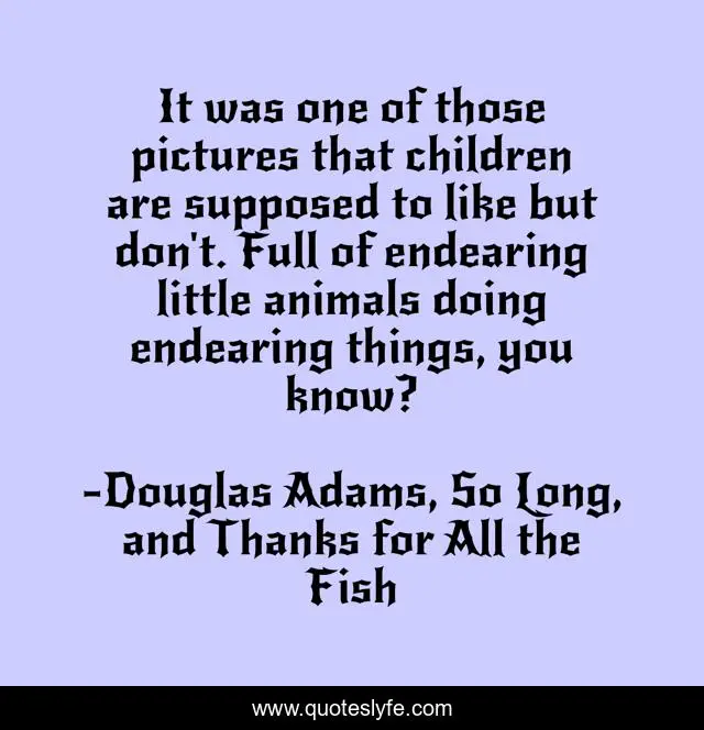 This page presents the quote "It was one of those pictures that children are supposed to like but don't. Full of endearing little animals doing endearing things, you know?". Author of this quote is Douglas Adams, So Long, and Thanks for All the Fish. .