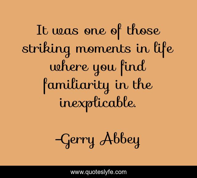 This page presents the quote "It was one of those striking moments in life where you find familiarity in the inexplicable.". Author of this quote is Gerry Abbey. This quote is about travel, travel-writing, asia, drinking, teachers, teaching, taiwan, memoir,.