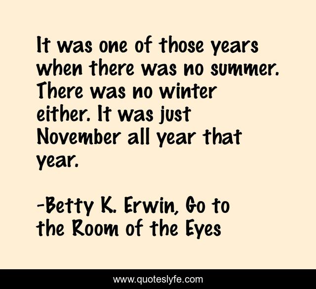 This page presents the quote "It was one of those years when there was no summer. There was no winter either. It was just November all year that year.". Author of this quote is Betty K. Erwin, Go to the Room of the Eyes. .