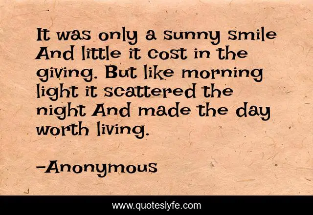 This page presents the quote "It was only a sunny smile And little it cost in the giving. But like morning light it scattered the night And made the day worth living.". Author of this quote is Anonymous. This quote is about helping, people,.