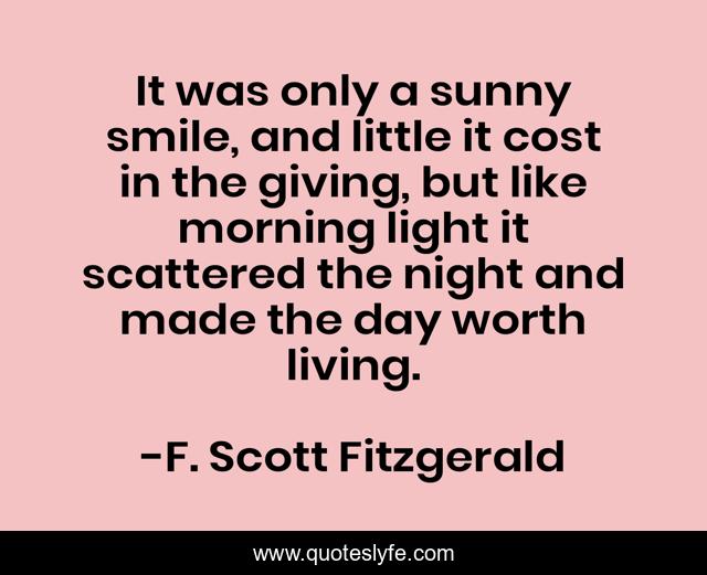 This page presents the quote "It was only a sunny smile, and little it cost in the giving, but like morning light it scattered the night and made the day worth living.". Author of this quote is F. Scott Fitzgerald. This quote is about life, happiness, inspiration,.