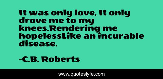 This page presents the quote "It was only love, It only drove me to my knees.Rendering me hopelessLike an incurable disease.". Author of this quote is C.B. Roberts. This quote is about the-hell-within-me, love, just, cb-roberts, poetry, heartbreak, affection,.