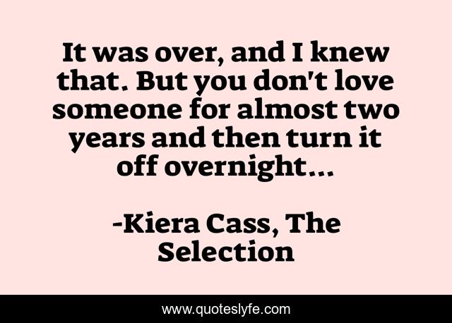This page presents the quote "It was over, and I knew that. But you don't love someone for almost two years and then turn it off overnight...". Author of this quote is Kiera Cass, The Selection. This quote is about america-singer, moving-on,.