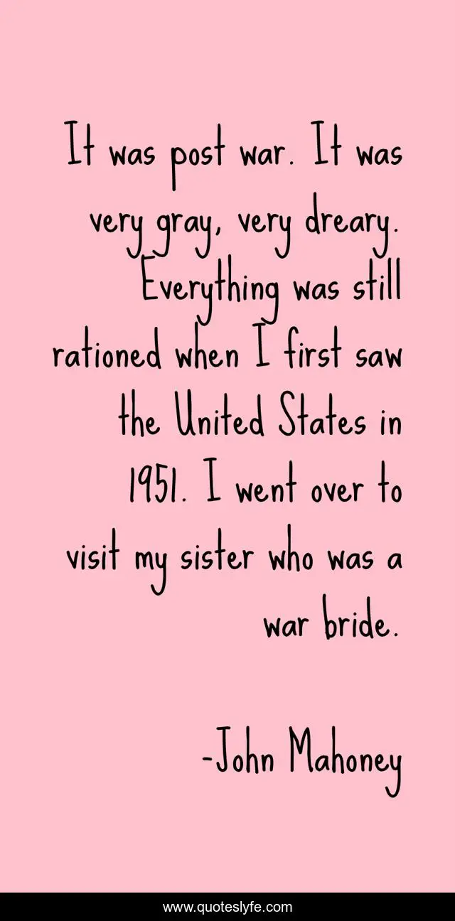 This page presents the quote "It was post war. It was very gray, very dreary. Everything was still rationed when I first saw the United States in 1951. I went over to visit my sister who was a war bride.". Author of this quote is John Mahoney. This quote is about bride, sister, gray,.
