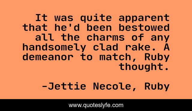 This page presents the quote "It was quite apparent that he'd been bestowed all the charms of any handsomely clad rake. A demeanor to match, Ruby thought.". Author of this quote is Jettie Necole, Ruby. This quote is about new-adult-paranormal-romance, regency-era, warlocks, vampires,.