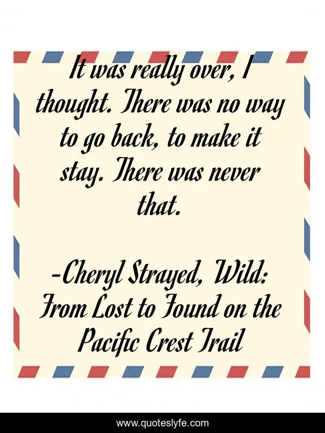This page presents the quote "It was really over, I thought. There was no way to go back, to make it stay. There was never that.". Author of this quote is Cheryl Strayed, Wild: From Lost to Found on the Pacific Crest Trail. .