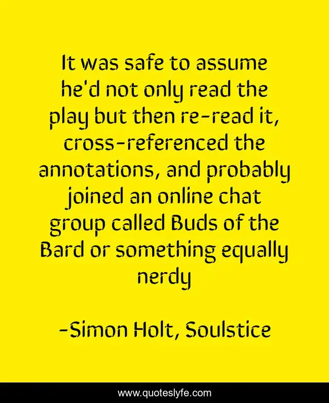 This page presents the quote "It was safe to assume he'd not only read the play but then re-read it, cross-referenced the annotations, and probably joined an online chat group called Buds of the Bard or something equally nerdy". Author of this quote is Simon Holt, Soulstice. This quote is about soulstice, funny, simon-holt, comedy,.