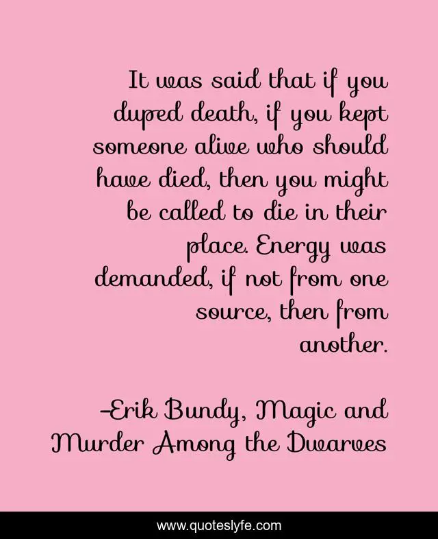 This page presents the quote "It was said that if you duped death, if you kept someone alive who should have died, then you might be called to die in their place. Energy was demanded, if not from one source, then from another.". Author of this quote is Erik Bundy, Magic and Murder Among the Dwarves. This quote is about energy, death, save-a-life, substitute,.